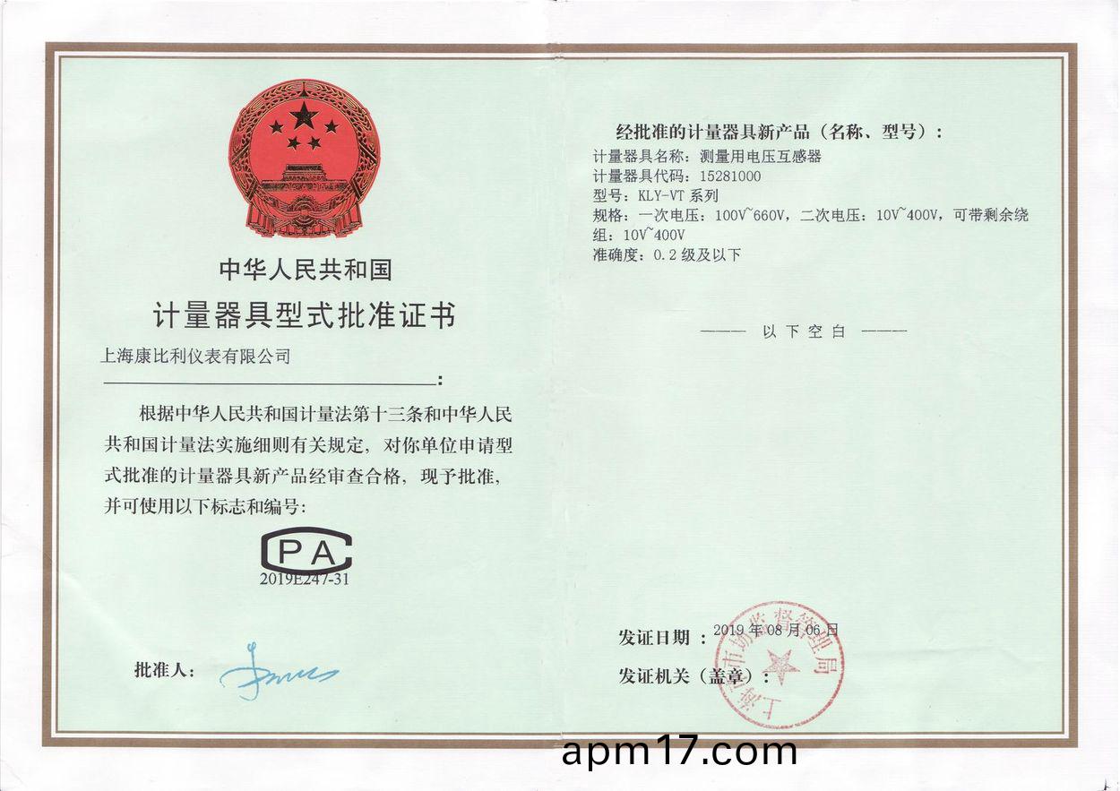 計(ji)量器具(ju)型式批準證書-測量用電壓(ya)互感器
